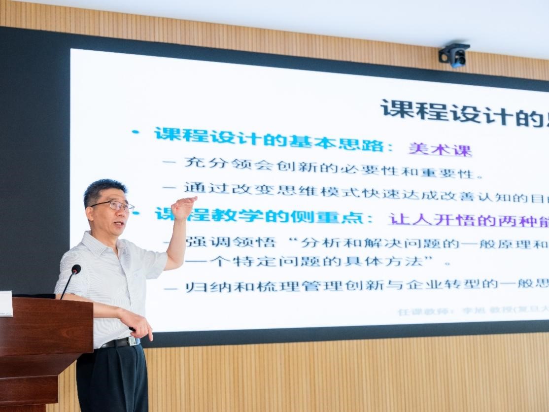 在课程授课环节,乐天使特别邀请复旦大学管理公司教授李旭,为同学们带来《商业模式创新与企业转型》的课程。在课堂上,李旭教授从时代巨变与企业选择、创新思维与创新途径、系统思考与构成的维度以及商业模式的构成与创新四个方面带领同学进行深入的思考和论证,同学们结合企业参访带来的启发结合自身管理经验、所在企业未来发展等方面展开广泛讨论。