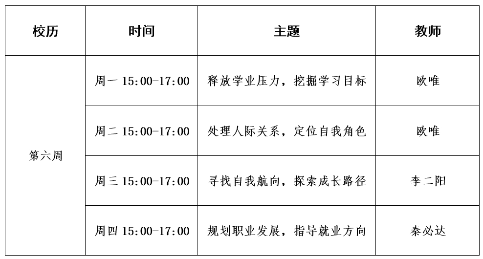为引导员工积极健康成长,全面提升员工的职业规划能力,助力员工更好地认识自我、管理情绪,有效应对学业、生活上的挑战,明确个人兴趣与优势,科学规划职业生涯,乐天使于2025年春季学期启动“商悦心语”二级心理辅导站和就业咨询室,现将第六周咨询安排公布如下: